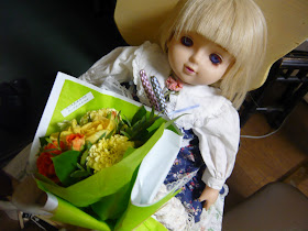 お花を頂いたのでルームメイトのマリリンに持たせてみた。お花って本当に嬉しい、心はずむ贈り物だよね。いや〜ときめきました。ありがとう。男子諸君、女の子にはどんどんお花プレゼントしたらいいと思うよ、これほんと。